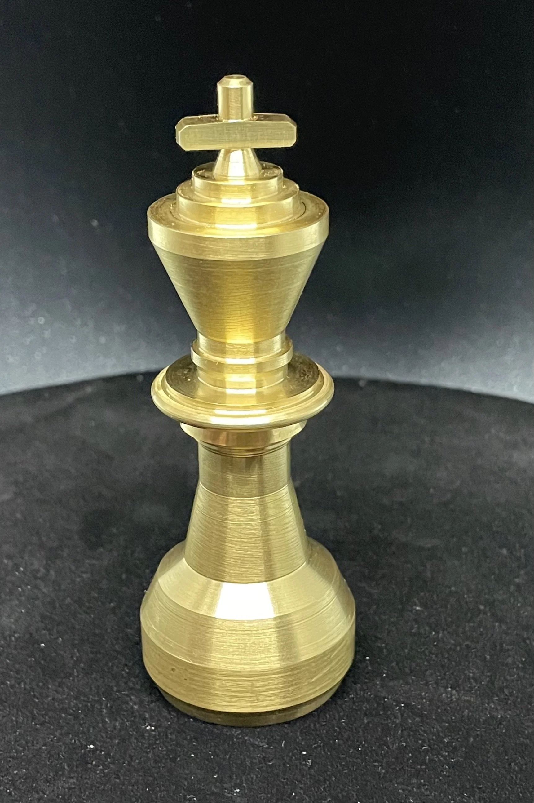 Machined Brass King Solid brass chess king piece made on manual metal lathe and milling machine, with custom wood and cloth box.